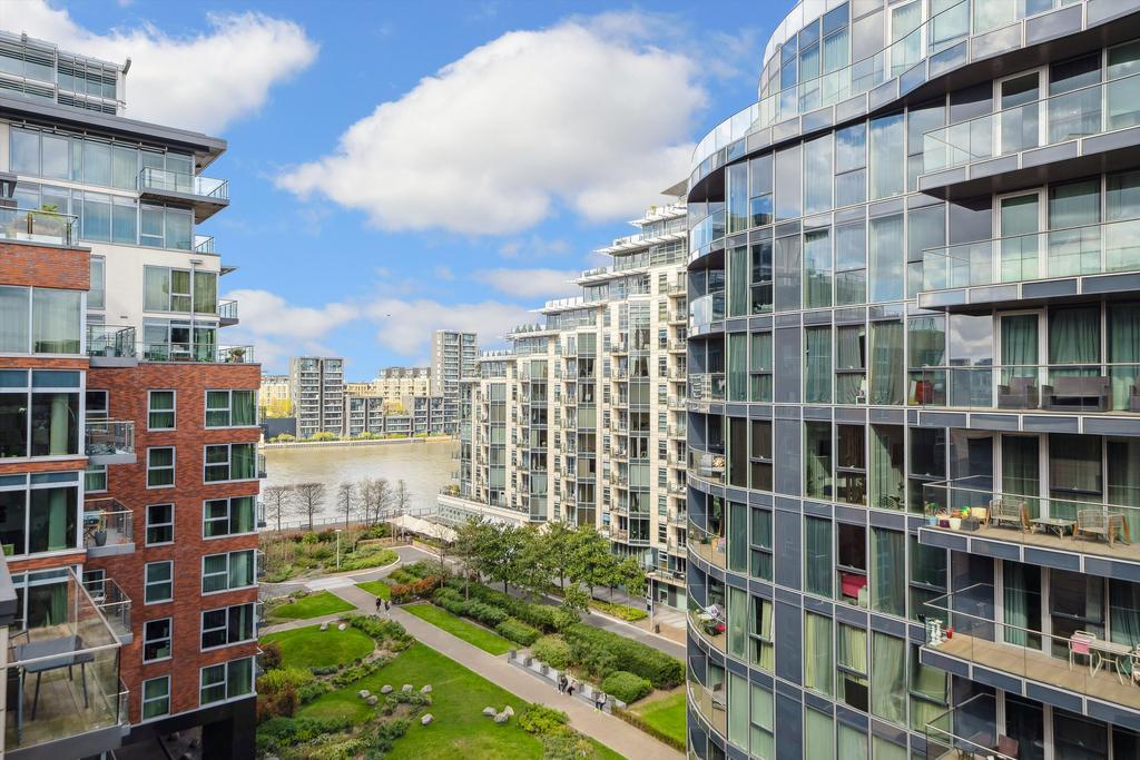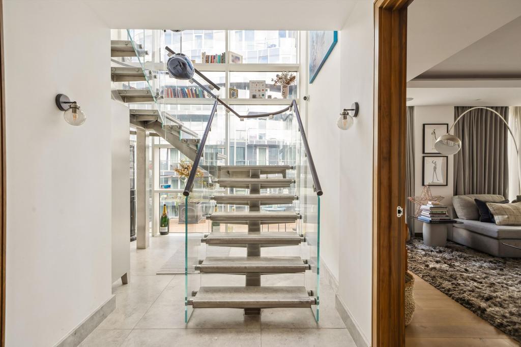Upon entering on the seventh floor, you are welcomed by a striking atrium, with a grand staircase that serves as a focal point, bathed in natural light. This level features an expansive open-plan kitchen and reception room, featuring high-end integrated appliances. Additionally, a well-proportioned double bedroom with an ensuite shower room and a convenient guest cloakroom are located on this floor. Both the reception room and bedroom open out to a fabulous terrace, perfect for al fresco dining, offering views of the tranquil communal gardens and the River Thames beyond.