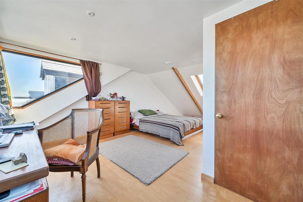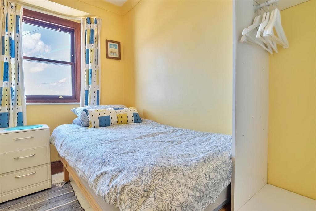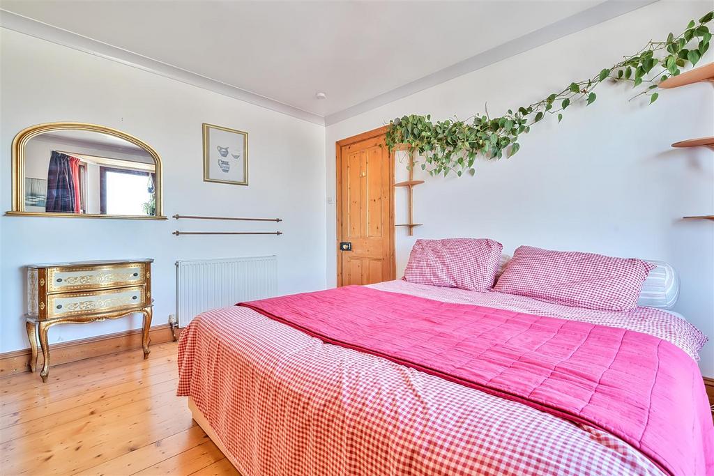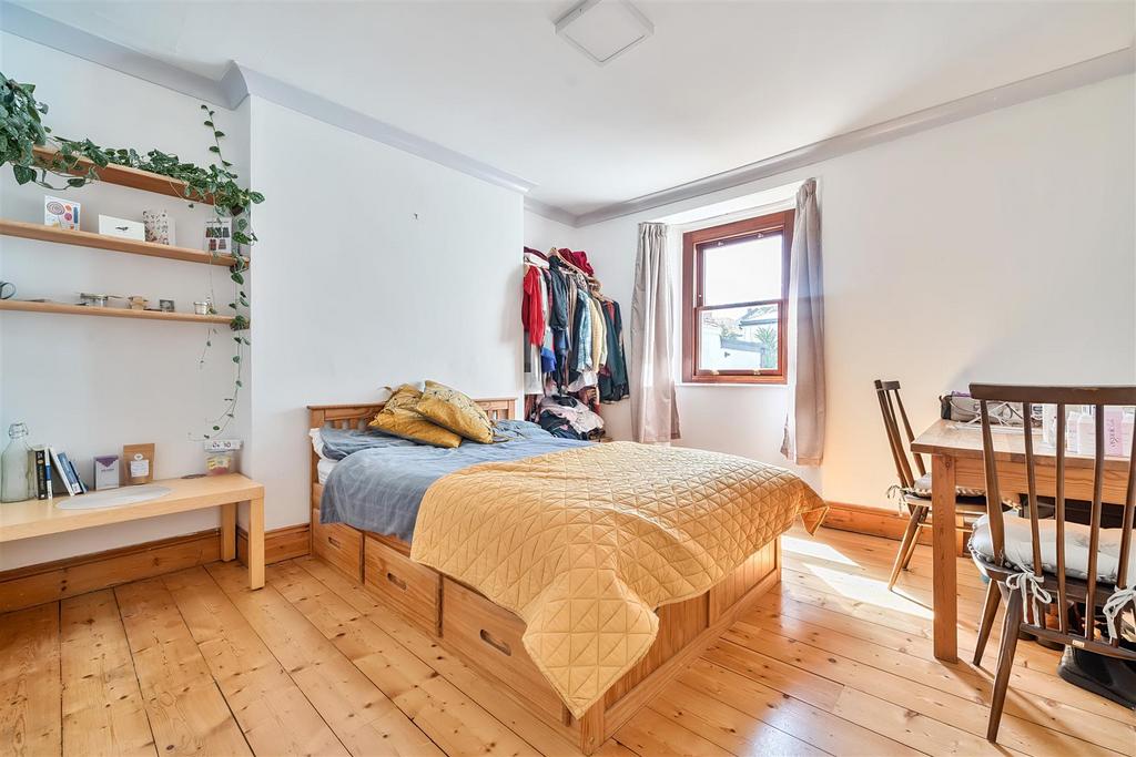 Bedroom Three - Another good sized double bedroom with south-west facing hardwood double glazed sash-style window overlooking the rear garden. Original stripped wood floor, radiator, original deep wood skirting boards.