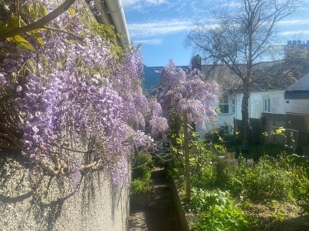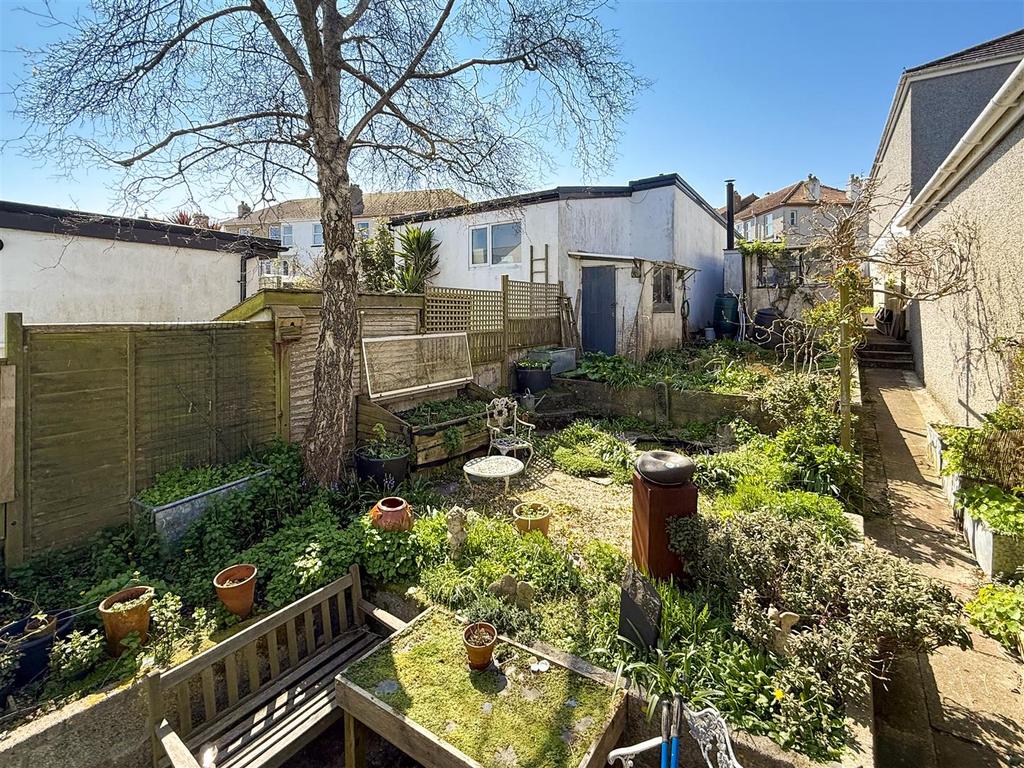 Rear Garden - A good sized courtyard-style garden accessed via the kitchen and French doors from the dining room. This sunny south-west facing terraced garden has been designed with a large number of raised vegetable, herb and flower beds, containing many different plants including wisteria, fig and honeysuckle. The garden provides several seating areas, a small nature pond, block-built potting shed and greenhouse. To the rear of the garden is a:-