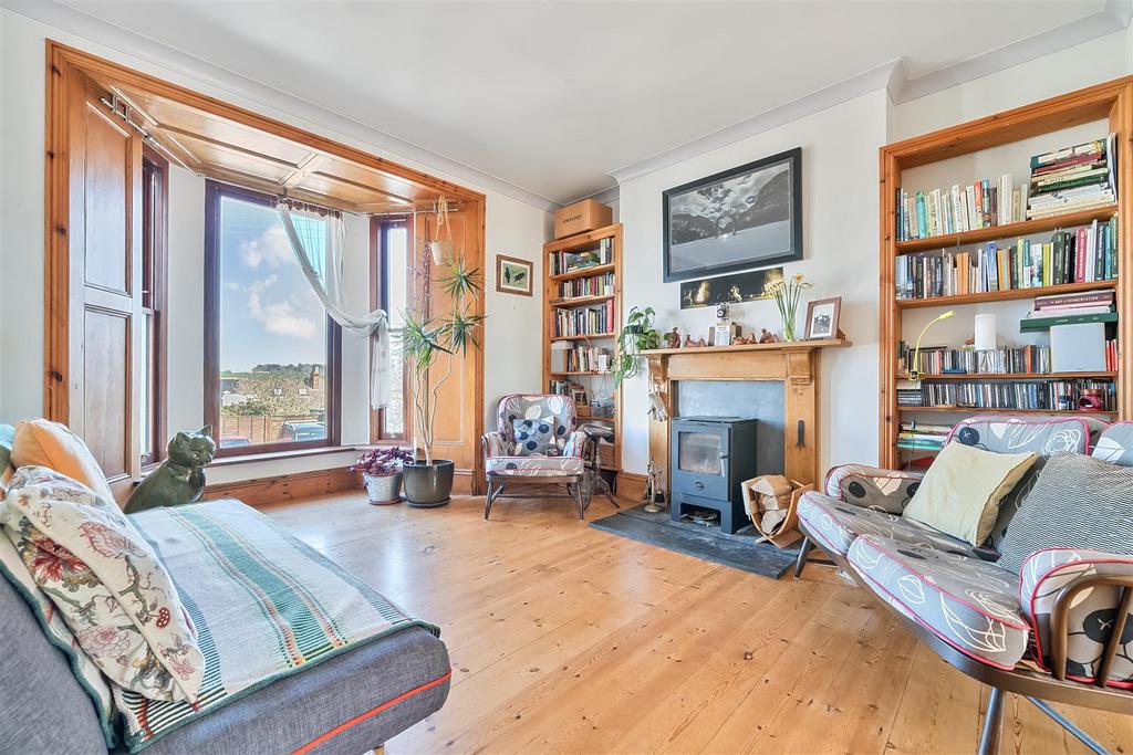 Living Room - A beautifully light and bright reception room open to the dining room and boasting a large floor-to-ceiling timber hardwood double glazed bay window with ornate wood panelling, enjoying an outlook between rooftops across the river to Flushing. Original stripped wood floor, deep timber skirting boards. Fireplace with freestanding wood burning stove on a slate hearth with wood mantel surround and built-in shelving to either side of the chimney breast. Radiator.