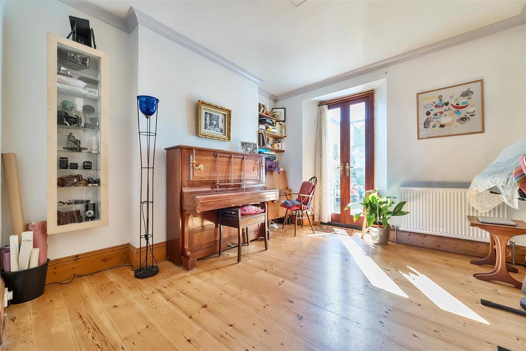 Dining Room - Open from the living room with an archway. Stripped wood original floor boards. Fireplace (currently boarded) with shelving to one side. Deep timber skirting boards. Glazed panel with shelving, borrowing natural light from the hallway. Radiator, hardwood double glazed French doors opening onto the rear courtyard.