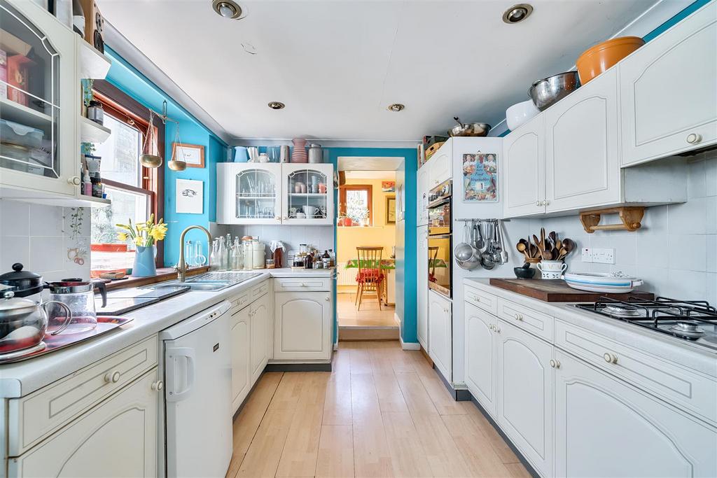 Kitchen - Range of eye and waist level units both above and below a roll top worksurface with one and a half bowl stainless steel sink/drainer unit with swan neck mixer tap. Built-in four ring gas hob with extractor fan. Built-in electric double oven. Space for under counter freezer. Part-tiled walls. Recessed ceiling lights. Two hardwood double glazed windows, one sash-style, overlooking the walled rear courtyard. Open to the:-