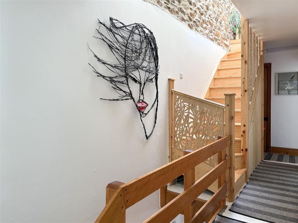 Landing - Timber doors to three bedrooms, solid pine staircase rising to the second floor, with bespoke panelling and custom made storage below. Attractive exposed stone wall, radiator, recessed ceiling lights, painted wooden flooring.