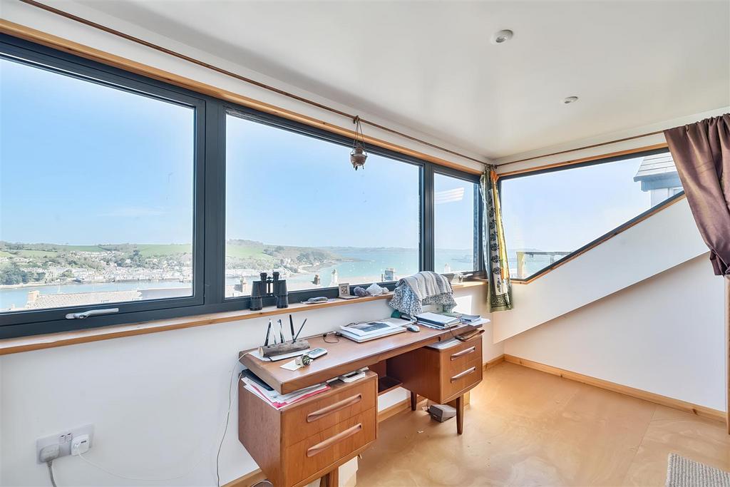 Bedroom One - A stunning principal bedroom occupying the whole of the top floor. Beautifully deigned and executed with a wonderful dormer window stretching the full length of the room and providing breath-taking panoramic water views over the Penryn River, across to Flushing, out over Falmouth Bay, with St Mawes Castle and St Anthony's Lighthouse in the distance. The views extend as far round as Pendennis Castle and the Falmouth Hotel. The room is flooded with natural light, not only from the broad dormer window, but also the large south-west facing Velux window to the rear. Wooden floor, exposed timber beams, recessed ceiling lights. Cleverly designed and subtly screened dual flush WC with timber and stone vanity unit housing a circular copper wash hand basin with matching copper mixer tap. Further Velux window and built-in timber shelving.