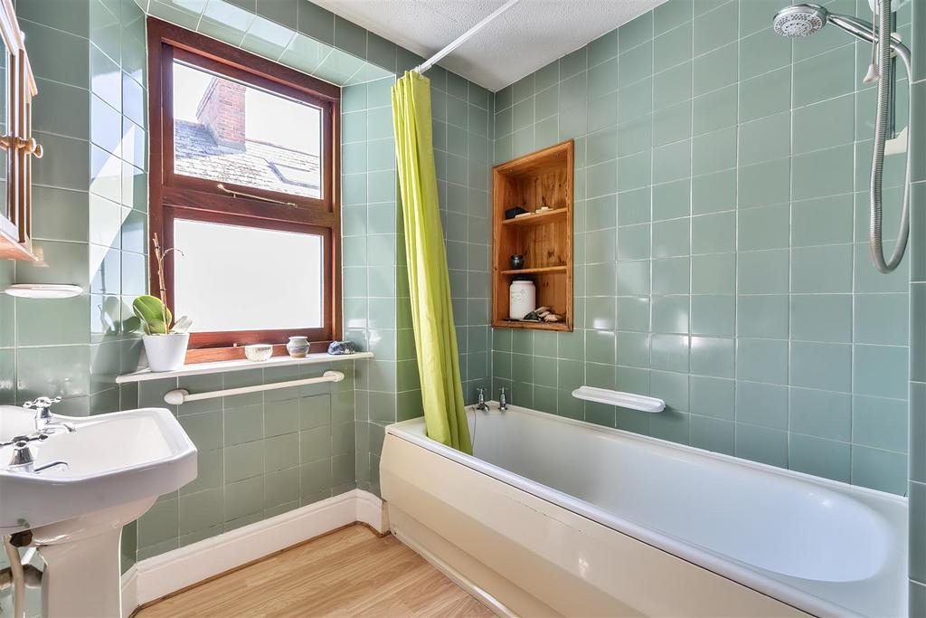 Family Bathroom - Panelled bath with Mira electric shower and tiled surround. Inset wooden shelving unit, pedestal wash hand basin. Further tiling to walls. Double glazed hardwood window to side aspect. Utility cupboard providing space and plumbing for washing machine and housing Baxi combination boiler servicing domestic heating and hot water. Radiator. Loft hatch.