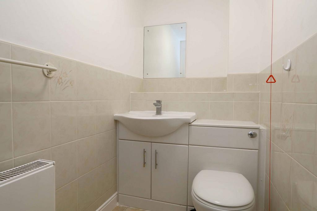 Low level WC, wash hand basin, cupboard below, half tiled walls, extractor, emergency pull cord.