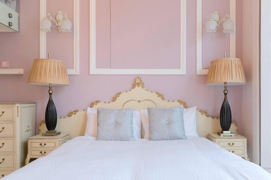 The master bedroom is an en-suite bedroom featuring a bathtub, a built-in clothes rail, and a lovely furniture set including a king-sized bed, vanity desk, and chest of drawers.