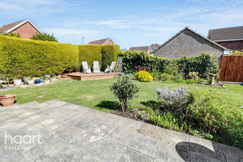 Patio leading to lawn with mature shrub and tree borders, raised decked area to rear, access to garage, side gated access to front.