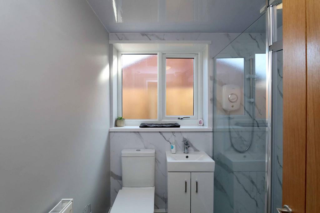 Walk in double shower enclosure with 'Triton' electric shower, vanity wash hand basin with cupboards below, low level WC. Tiled floor. Extractor. Upvc double glazed side window.