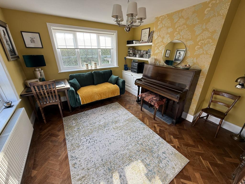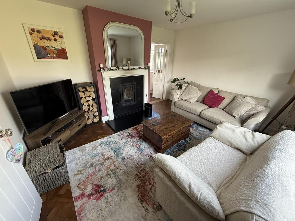 Double glazed window to front, parquet flooring, integral lighting, radiator, ‘Contura’ cast iron fireplace with glazed door, timber surround and slate hearth. French doors through to: