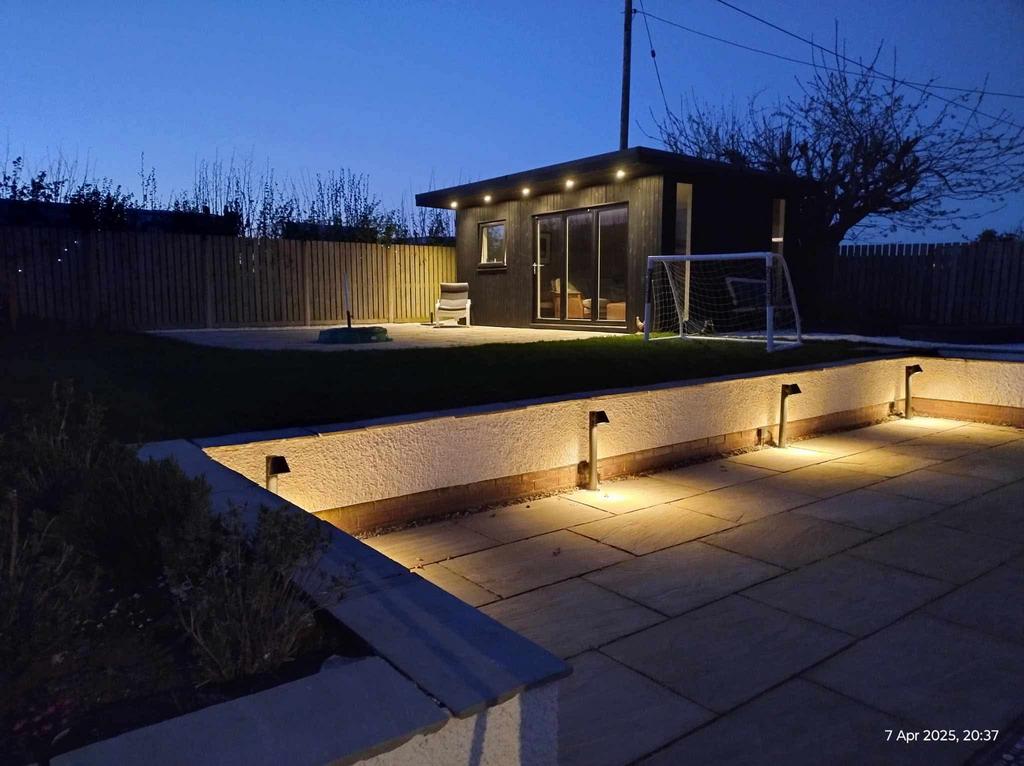 Bi-fold doors opening onto a further paved terrace. Modern electric ‘Dimplex’ real flame effect fire, two floor to ceiling double glazed windows to side further double-glazed window to front modern slatted timber wall integrated lighting and power lighting connected.