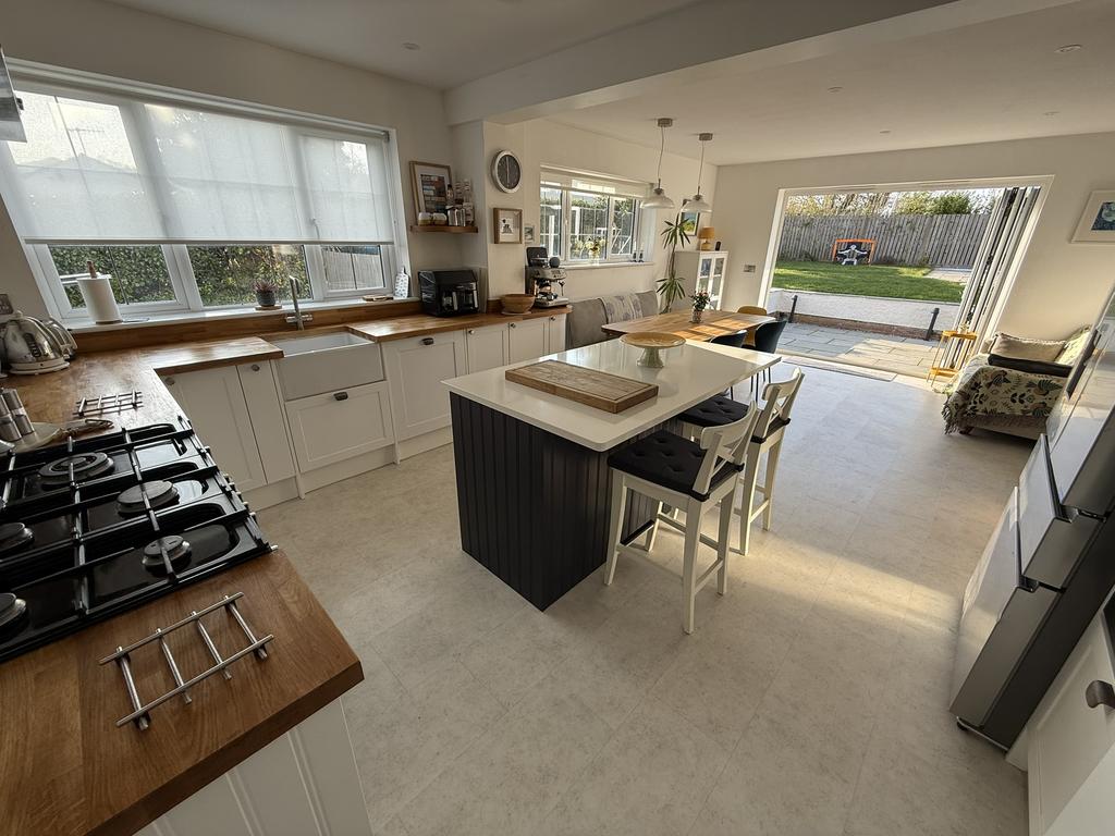 Double glazed bi fold doors to rear terrace, base and wall units with ‘butchers block’ style work surfaces over, space suitable for range style cooker with stainless steel extractor hood over, enamel Belfast style sink with mixed taps over, integrated electric oven and microwave, island unit with quartz work services over, integrated lighting, radiator, two-double glazed windows to side and door to: