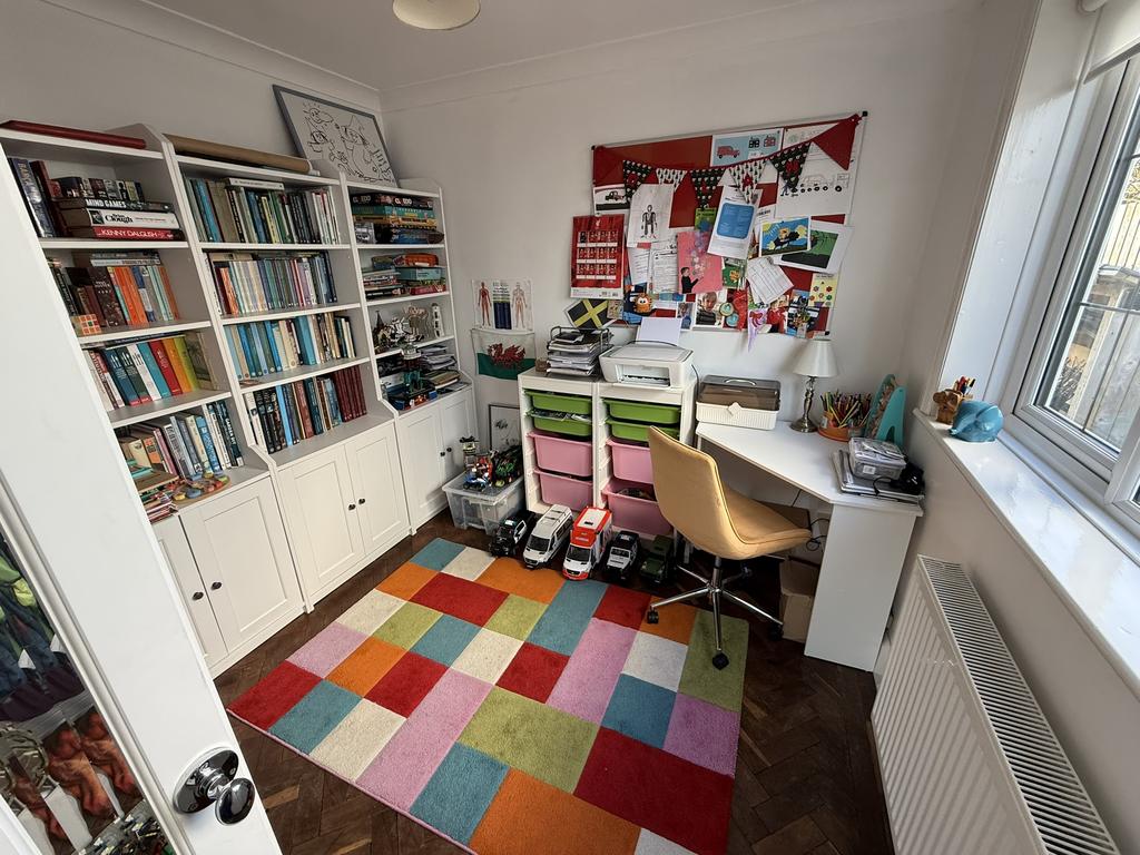 Double glazed windows to front and side, radiator, parquet flooring, built in alcove cupboards and display shelving
