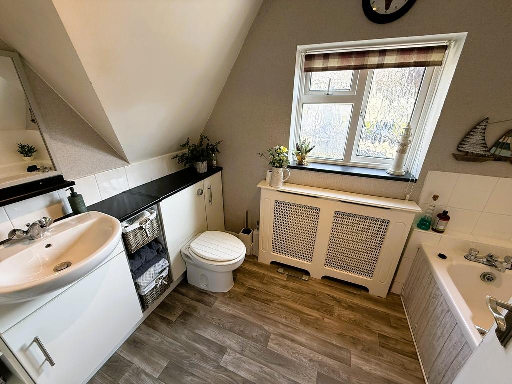 Vanity unit housing wash hand basin and WC, ladder-style heated towel rail, radiator, double-glazed window to rear, panelled bath and tiled splashbacks.