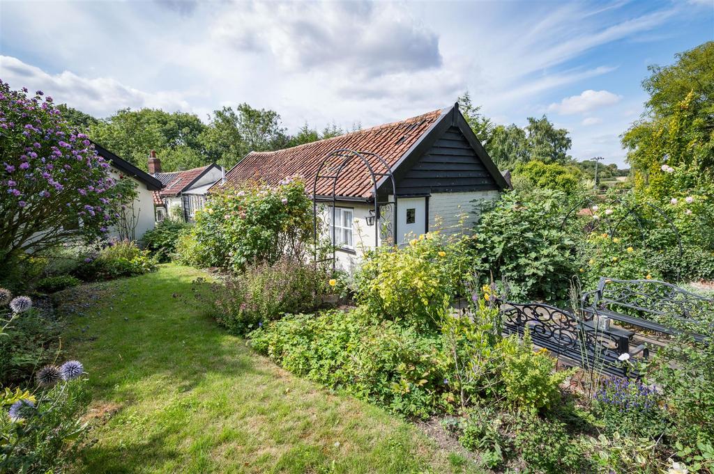 Located to the southern end of Hitcham, Timberlea is a detached period dwelling that can be aptly described as truly ‘one-off’. Covering some 1,800sq.ft, the building is predominantly single storey, and is likely to be a result of merging three or four modest tenements. This is certainly the case for the far northern section, where the owners (who purchased the property in 1986) built the connecting central conservatory. Under the same ownership, the front porch and a detached single garage was also built.