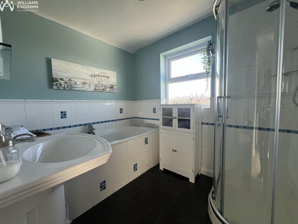 Three piece suite comprising bath, wash hand basin and shower enclosure. Window to rear.