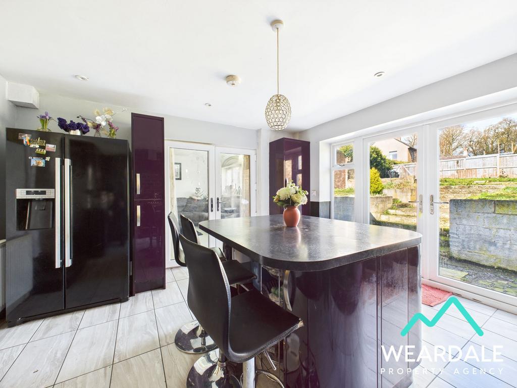 -The kitchen provides external access to the garden via uPVC patio doors, and onward internal access to the living/dining room via uPVC double doors with clear panes