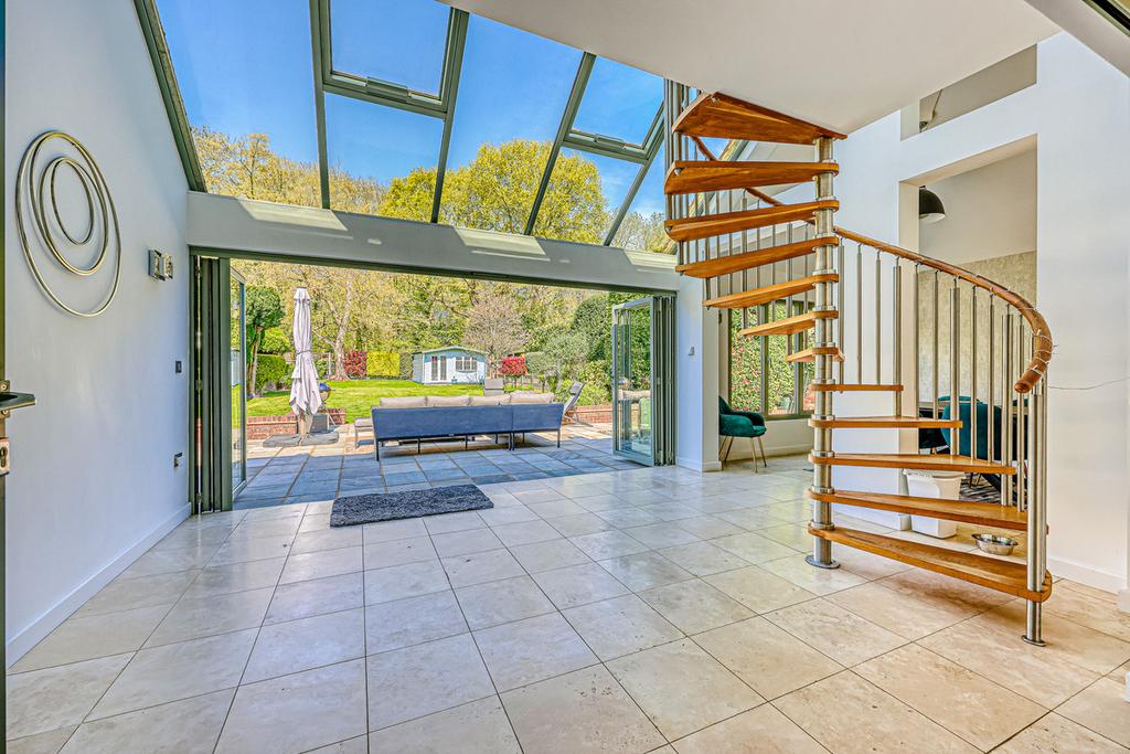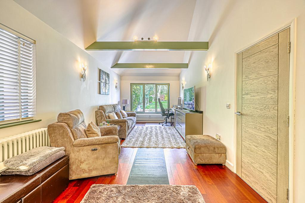 Inside, the ground floor welcomes you with a bright entrance porch leading to a spacious lounge and a luxury fitted kitchen that seamlessly opens into a stunning vaulted family area. Floor-to-ceiling heat-reflective glass windows flood the space with natural light and provide uninterrupted views of the west-facing rear garden. A utility room, shower room, and two additional double bedrooms (one with an ensuite, the other with a dressing room) add further versatility to the layout. A second sitting room offers the perfect opportunity for a fourth ground-floor bedroom, home office, or additional reception space.