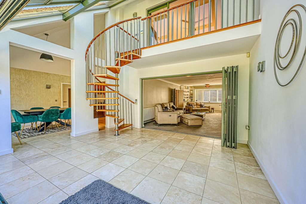 Upstairs, a contemporary open steel spiral staircase leads to a dramatic minstrel gallery, showcasing the vaulted ceiling and overlooking the garden. The main bedroom is a true retreat, accessed via elegant French doors and featuring a walk-in wardrobe, ensuite, and private balcony — the perfect spot to enjoy the evening sun.