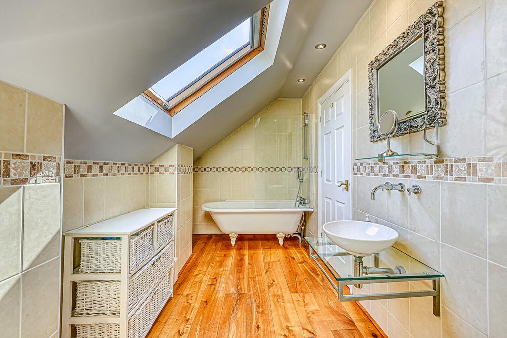 Double glazed Velux window allowing natural light. The bathroom features a low-level WC, a freestanding roll-edge bath with shower above and screen panel, and a wall-mounted vanity sink on a glass stand with a mixer tap. Additional highlights include a contemporary vertical radiator, oak wood flooring, fully tiled walls, and a bidet.