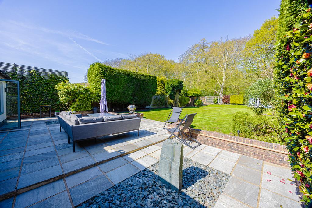 Beautifully landscaped west-facing rear garden, approximately 100ft in length, starting with a spacious patio and extending to a well-maintained lawn with flower beds. Additional features include side access, power points, an outside tap, a summer cabin, a shed, and a gate leading directly to Shipwrights Wood at the rear.