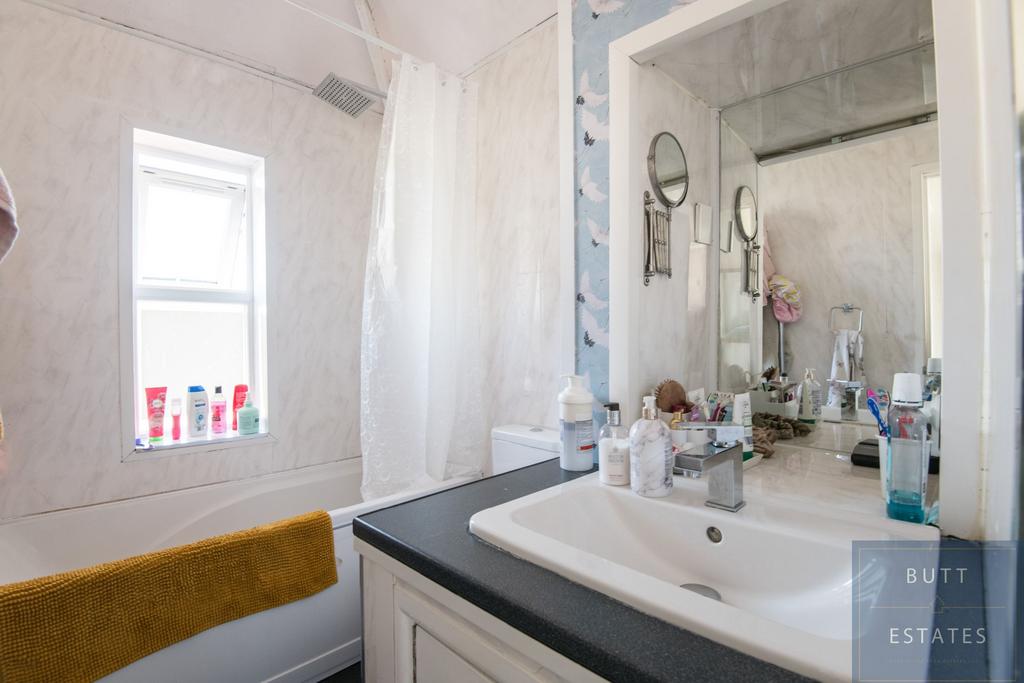 Matching three piece suite, panelled bath, low level wc, modern wash basin, vanity unit, mixer tap, heated chrome towel rail, obscure rear double glazed window.