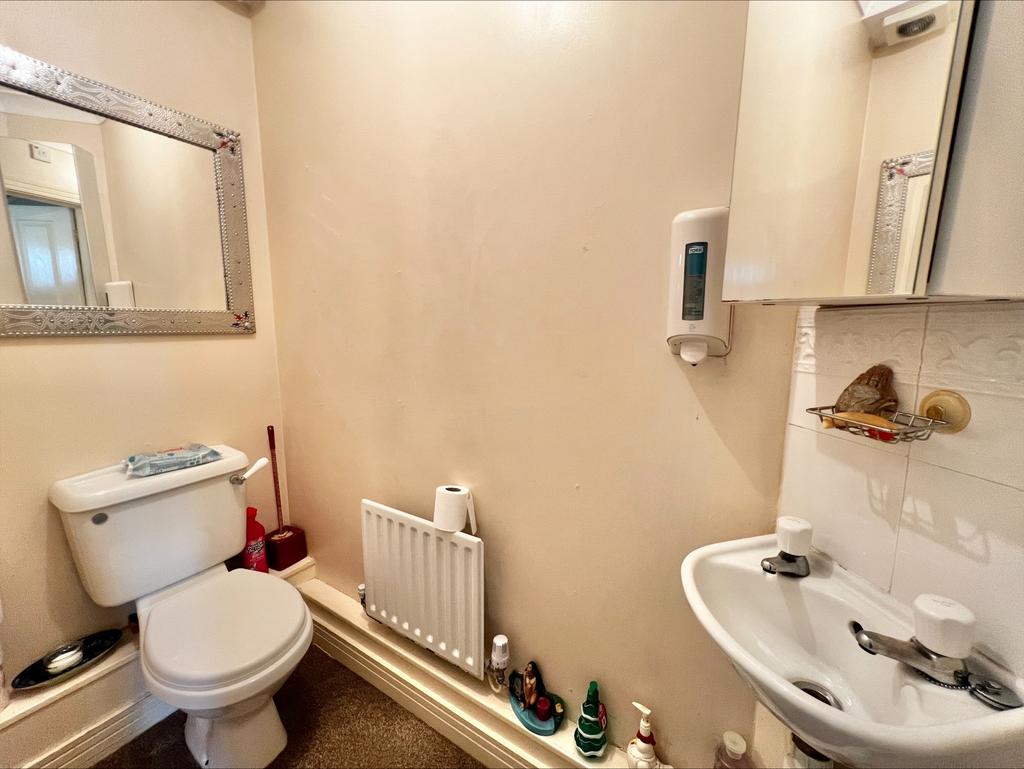 Having a fitted carpet, central heating radiator, wash hand basin, close coupled WC, extractor fan, ceiling light point