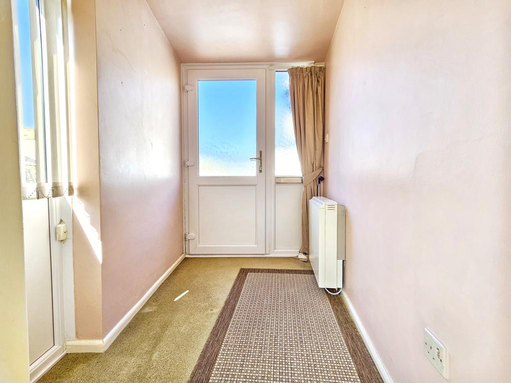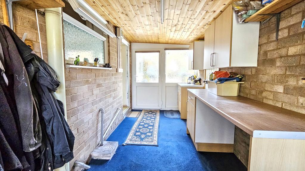 Side ENTRANCE/UTILITY (4.25m x 2.09m approx)(13'9" x 6'8" approx) with carpet, laminate work surfaces with two floor cupboards and three wall cupboards. Four power points, fluorescent strip lighting, doors to front drive, kitchen, garage and rear garden.