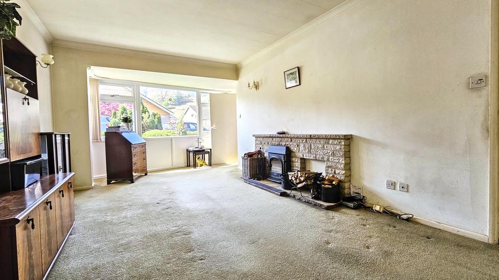 SITTING ROOM (6.3m x 3.52m approx)( 20'1" x 11'5" approx) with fitted carpet, large front window, side window, stone fireplace with tiled hearth, mantel and coal/log burner. Coving, four wall lights, TV aerial point, two power points and glazed door to: