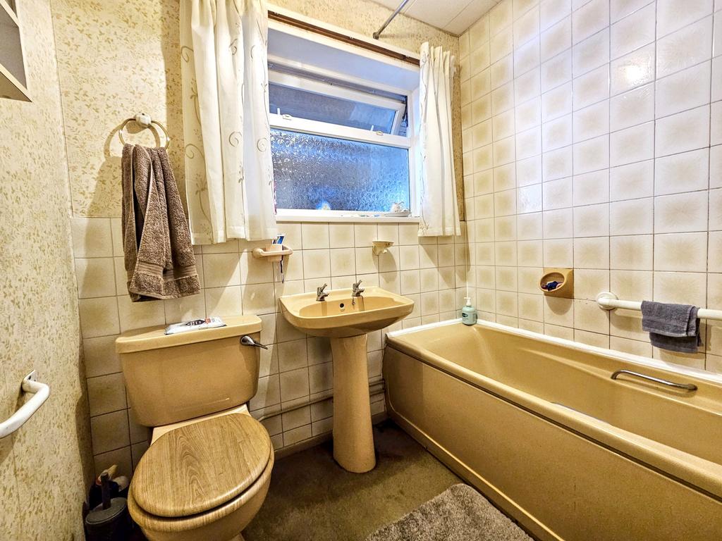 BATHROOM with part tiled walls, panelled bath with shower over, WC and washbasin. Window and electric radiator.