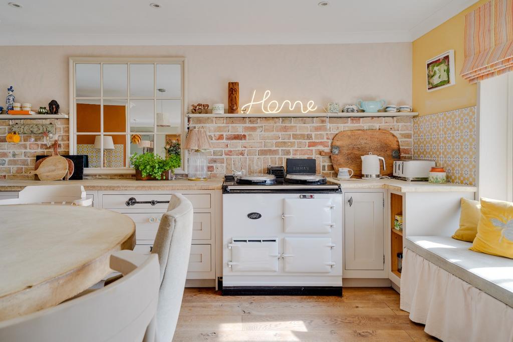 Double glazed window to rear with views over paddocks to the rear, fitted with an attractive range of wall and base level units with feature concrete work surfaces over, space for 2 plate AGA, range of bespoke wall units, inset butler sink with mixer tap, integrated dishwasher, space for American style fridge freezer, brick feature splashbacks, central island with concrete work surface over, solid wood flooring, inset spotlights.