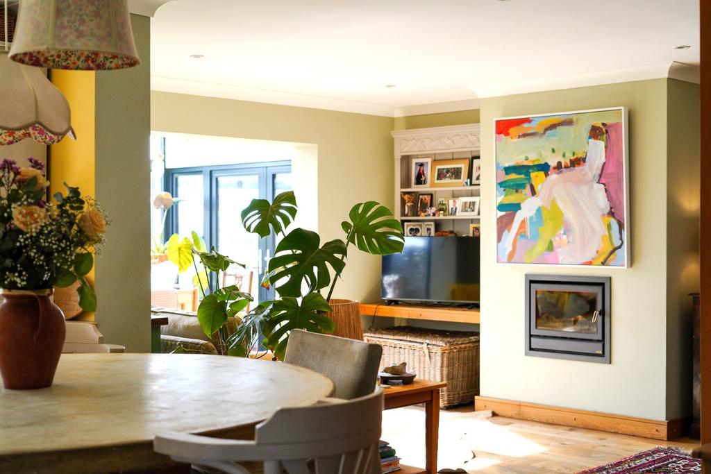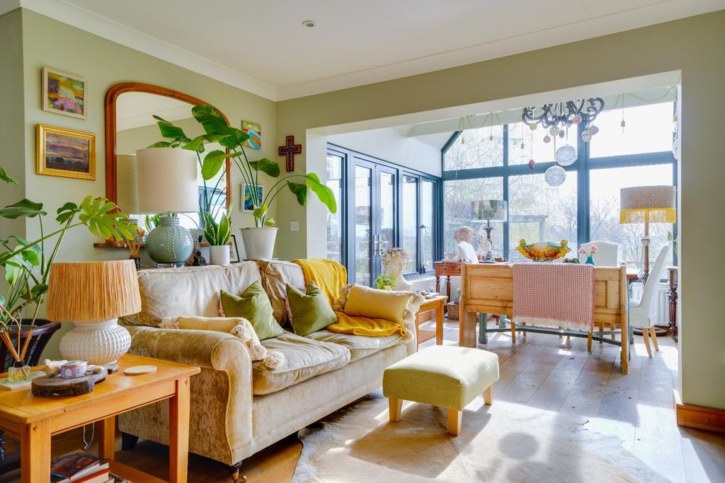 Stunning vaulted glazed gable allowing light to flood into the property, double glazing and double French doors to both sides giving access to the patio and the garden, solid wood flooring, radiator.