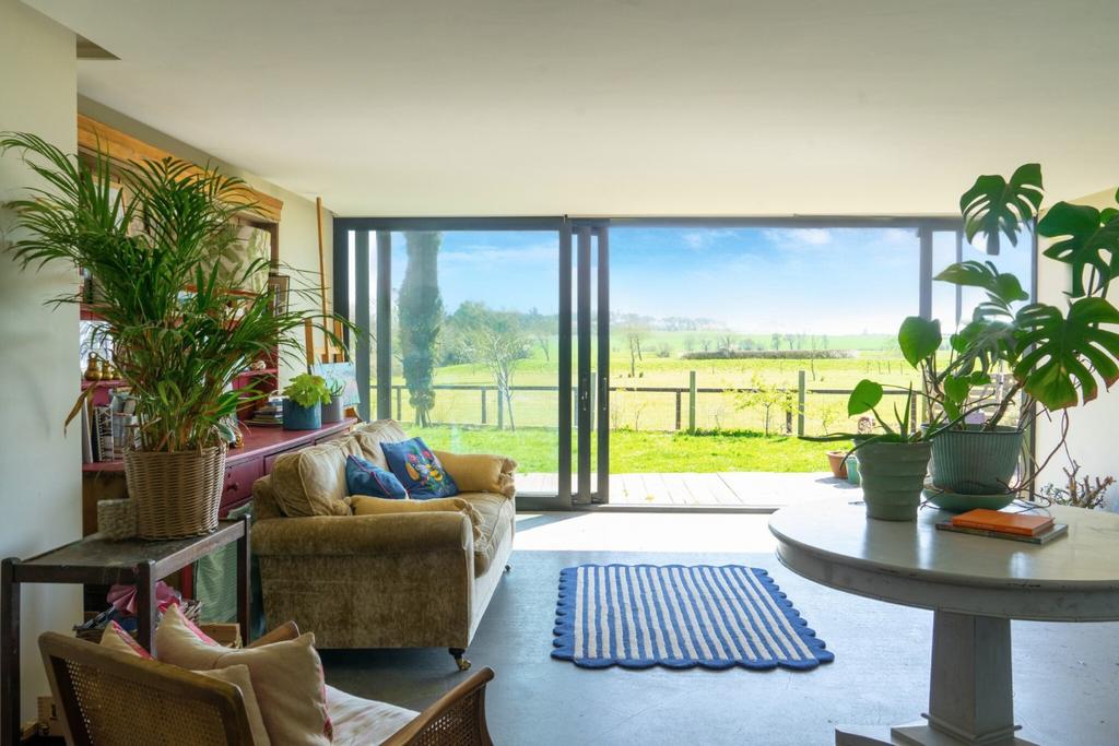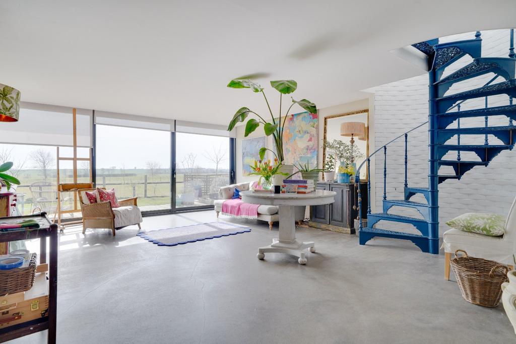 Full width and height patio sliding doors giving views over the garden and paddocks beyond. Feature concrete floor with under floor heating, spiral staircase leading to Master bedroom.