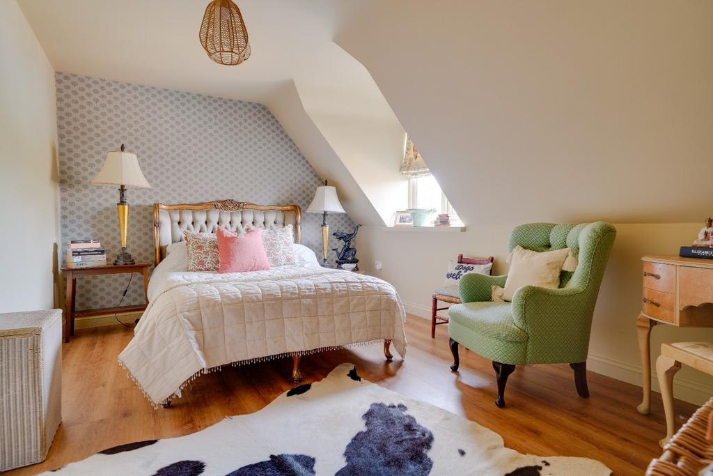 The spacious ground floor accommodation comprises an entrance hall, formal living room with views over the garden, bespoke designed kitchen/breakfast room open plan to a dining/family room. The garden room with full height glazed gable is also an impressive room making the most of the southerly countryside views over paddocks. A snug, cute study area, cloakroom, utility room and studio/further reception room complete the ground floor accommodation.