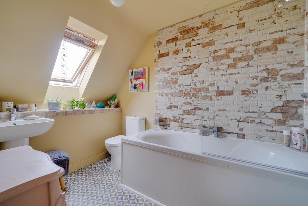 A stunning room with two velux windows to side, fitted with a matching three piece suite comprising freestanding bath with feature mixer tap and shower attachment, vanity unit with inset wash hand basin and close coupled WC, waxed wood flooring.