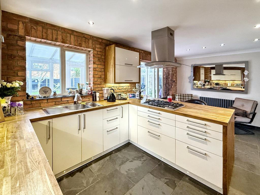 The kitchen has plenty of cupboards for storage with an island in the centre featuring a modern hob & extractor hood.