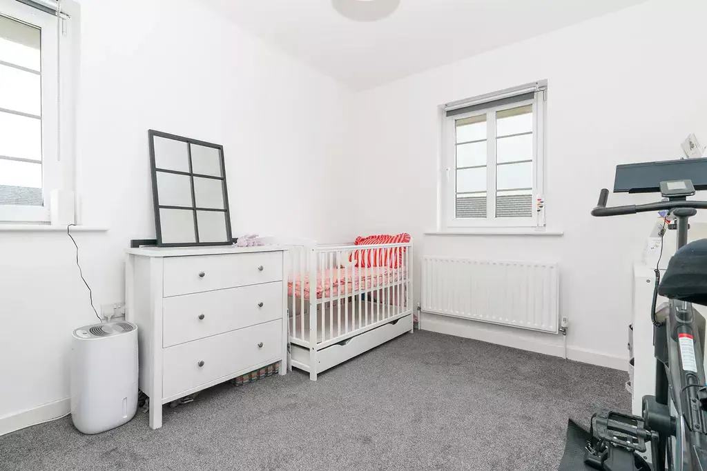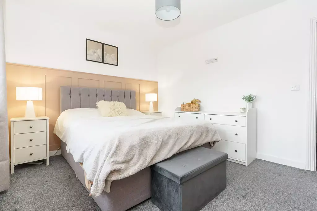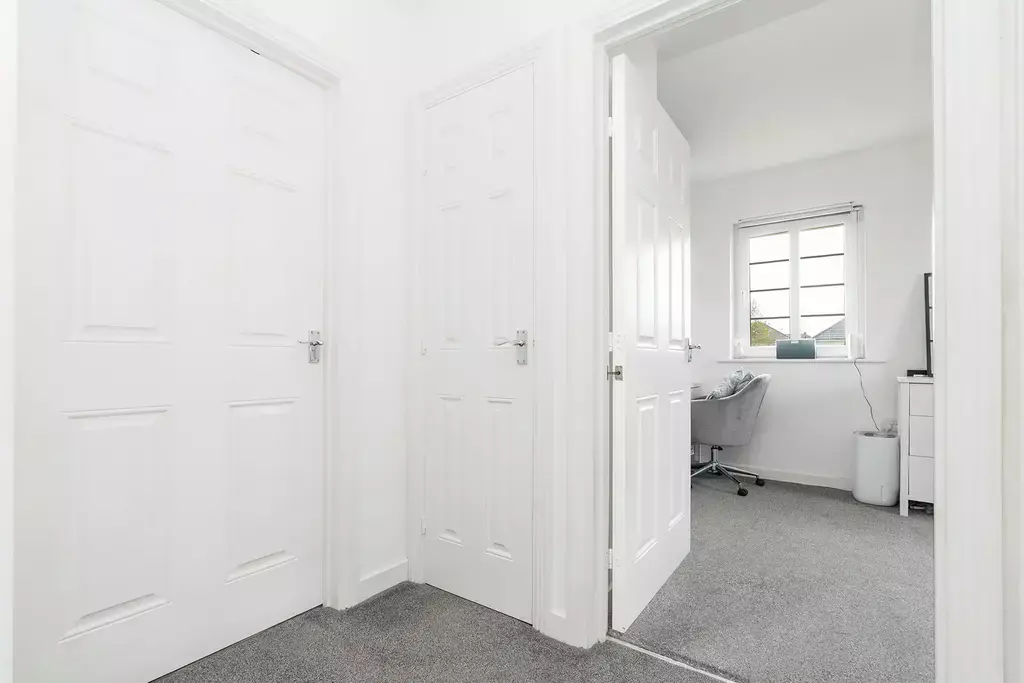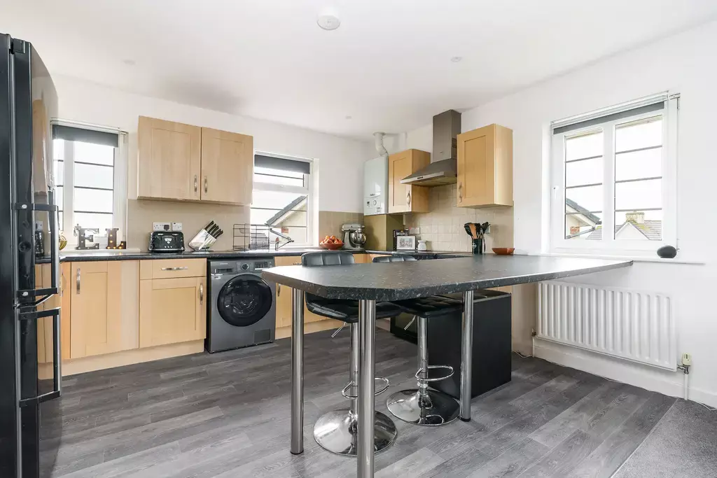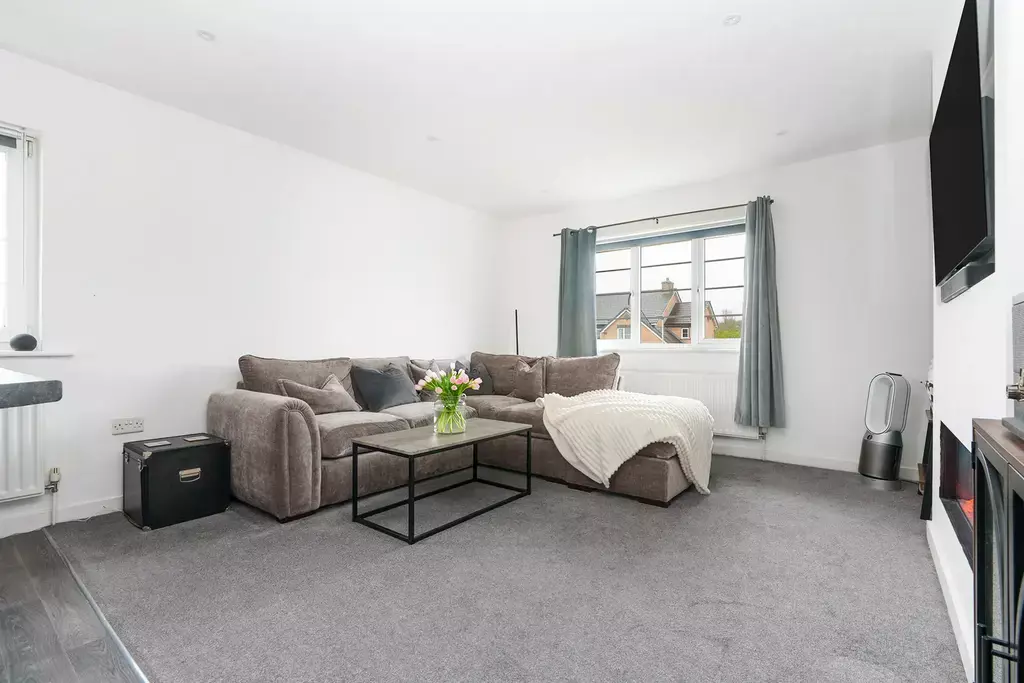 Internally, the welcoming entrance hall with stairs leads up to a beautifully presented living space. The heart of the home is the impressive triple-aspect open-plan living room, featuring a bespoke media wall with a contemporary fireplace—creating a stylish yet cosy focal point. The modern breakfast kitchen is seamlessly open to the living area, providing a fantastic space for both everyday living and entertaining.