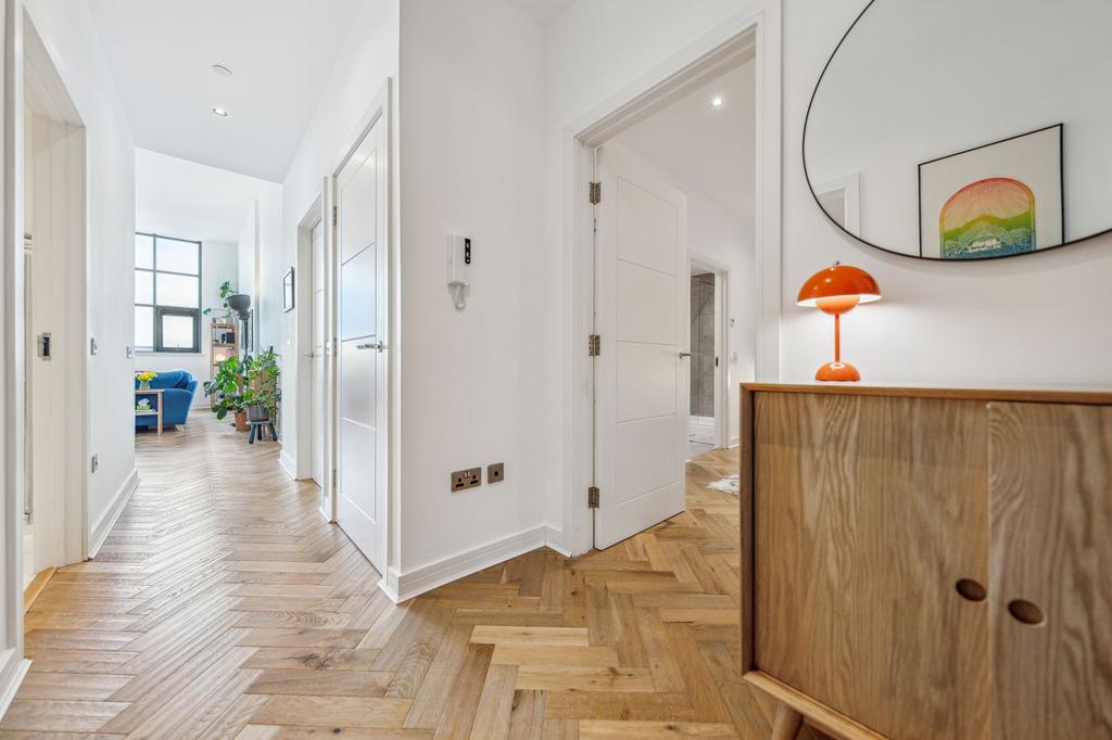 Internally, the apartment is introduced via a welcoming reception hallway, leading into the stunning open-plan living space. Here, a large factory-style window creates a striking focal point, flooding the space with natural light and offering spectacular views. The sleek, contemporary kitchen – designed by award-winning supplier Jackton Moore – features high-quality integrated appliances, perfectly complementing the spacious lounge area.
