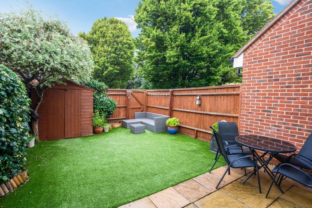 The garden is mostly laid to lawn with a small patio area for outdoor relaxation and accompanies a rear access gate.