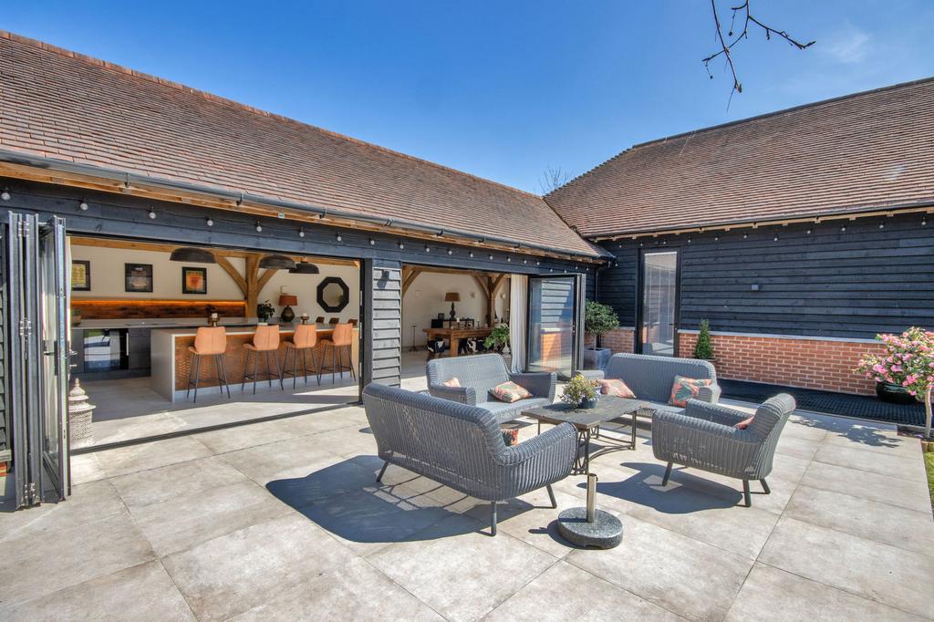 Entrance hall with oak and glazed staircase, dual-aspect and open-plan kitchen/dining/sitting room with vaulted ceilings, stunning contemporary kitchen with quartz worktops, built-in oven, built-in microwave, built-in wine cooler, built-in hob with downdraft extractor fan, integrated dishwasher, two sets of bi-fold doors to garden and bi-fold doors to decking with delightful rural views; utility room with fitted cupboards, integrated fridge/freezer, space for washing machine and door to garden; cloakroom with WC and washbasin; family room with the former forge fireplace with large bellows and wood burner, exposed iron stone wall, part vaulted ceiling, beams; bedroom with double doors to garden and staircase to vaulted dressing room with built-in cupboards and vaulted bathroom with roll-top bath with mixer tap and shower spray, washbasin and WC; dual-aspect bedroom with door to garden and bi-fold doors to decking with delightful rural views and Jack-and-Jill' shower room with shower, WC and washbasin and door to bedroom with bi-fold doors to decking with delightful rural views; and first floor with landing, dual-aspect bedroom with vaulted ceiling and rooflight windows with delightful rural views; and bathroom with rolltop bath, separate shower, vanity wash basin, WC and eaves access.