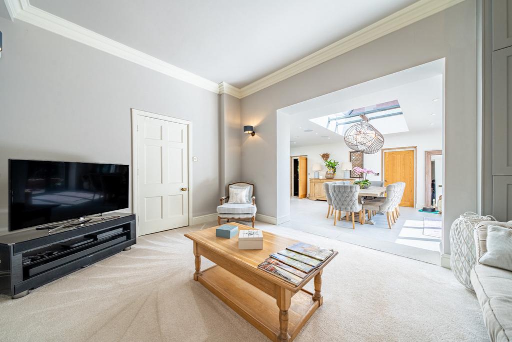 Accessed off the dining room, a door leads through to a further family room. This is a lovely space for relaxing in front of a log burner, and adjacent to this is a wine cooler and drinks area with built-in cabinetry, and there is a door leading out to the back garden terrace.