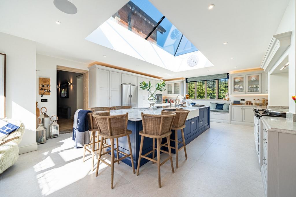 The breakfast kitchen is a truly stunning room which has been recently installed by the current owners. The kitchen area features a large central island unit, complete with granite work surfaces and inlaid wine coolers. There are Miele Appliances throughout the kitchen, including a combination steam oven with Sous Vide option, combination oven with a microwave. There is also a warming draw and a vacuum packing drawer. In addition, a multi-purpose induction hob including both teppanyaki and wok stations. These are inset into the island unit along with sink units incorporating a Quooker boiler tap with filtered chilled and sparkling options. There is also a dishwasher and a great seating area. There is also a 5-oven electric Aga. Above this island unit and the dining area are glazed roof lanterns flooding the room with natural light. The designer kitchen has bespoke cabinetry of the highest standards, and the room itself runs the whole width of the home.