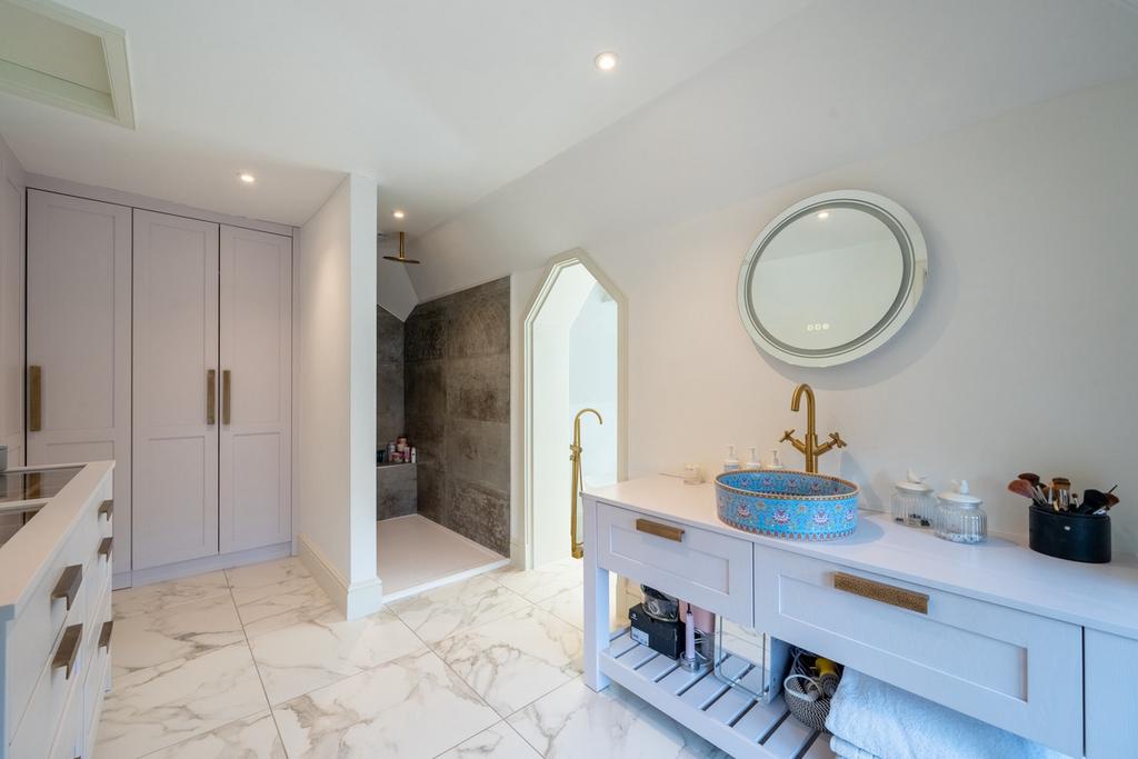 The final reception room is part of a former cottage, and this area could still be used as this. Independent external access leads into a lovely lounge room, again with a log burner, and a staircase leads to a double bedroom with fitted wardrobes and an ensuite bathroom featuring a dressing area, walk-in shower and separate bath area.