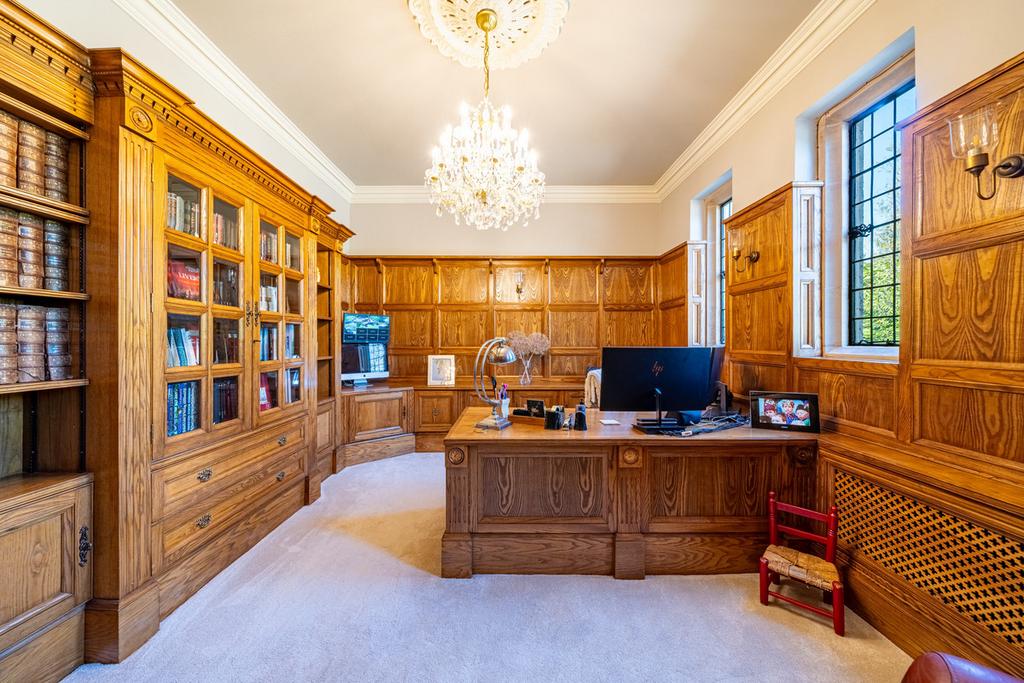 Located off the hallway, there is also a formal study room, which is well-appointed with a range of quality storage units and a desk, and a wood-panelled wall surrounds and, therefore, it is perfect for those looking to work from home.