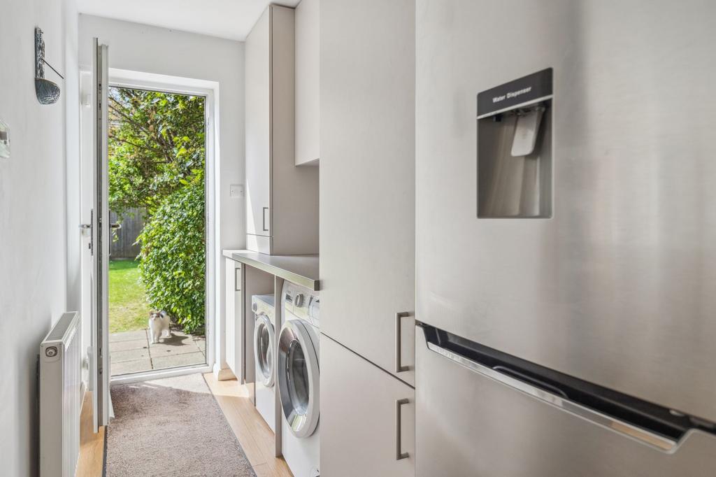 The kitchen itself is contemporary and thoughtfully designed, fitted with sleek cabinetry and generous workspace, offering ample space for modern appliances including a dishwasher, two integrated ovens, and induction hob with an overhead extractor. A spacious dining area sits seamlessly within the kitchen, ideal for family meals and entertaining while remaining at the heart of the home. From here, sliding patio doors open out directly onto the garden, creating an easy indoor-outdoor living experience, bringing in lots of natural light.