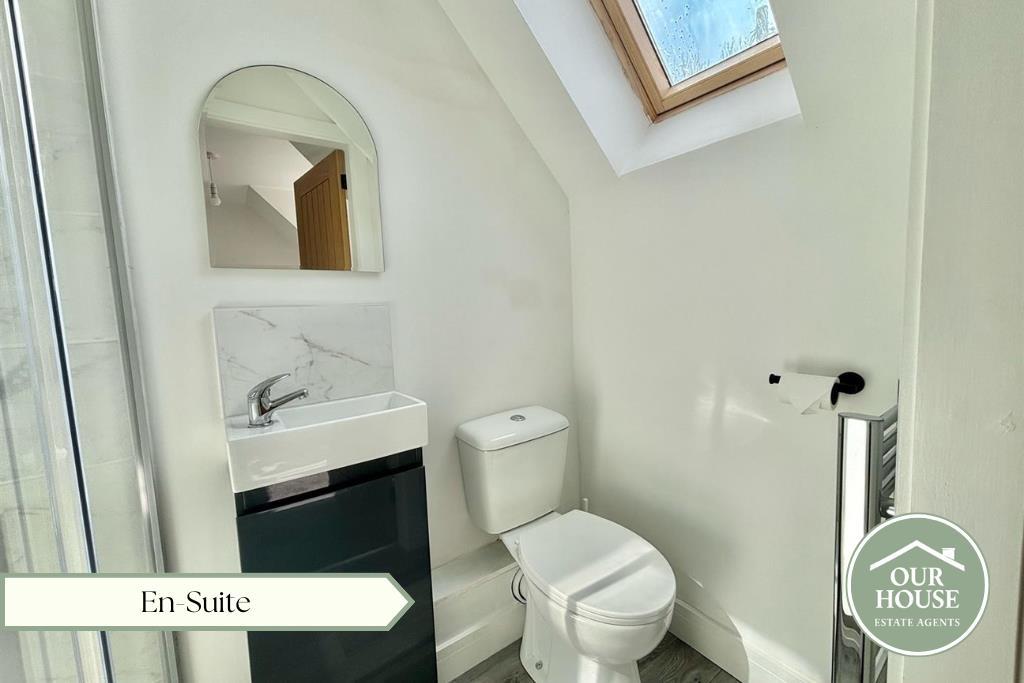 En-Suite - Front facing velux window, W.C, Hand wash basin, Step in shower, Heated towel rail, Partly tiled walls, Extractor fan and vinyl floor.
