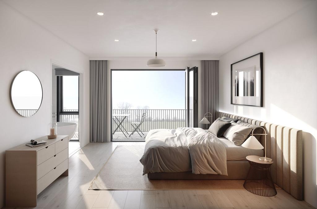 Upstairs, the principal bedroom suite includes a private balcony and an en-suite bathroom. Two further double bedrooms and a sleek family bathroom offer spacious, flexible accommodation.