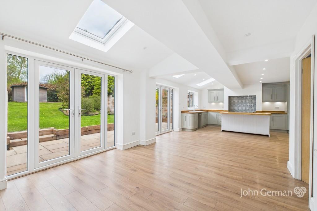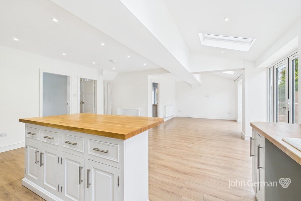 Across the rear of the property is the open plan living and dining kitchen, to one side of the extension is a bespoke Shaker style kitchen providing plenty of storage complemented by contrasting worktops along with an electric Range cooker plus a central island/breakfast bar. There is plenty of space for a dining table to the centre and to the left-hand side there is a lovely living area. Velux windows and two sets of French doors let lots of light into this superb living area.