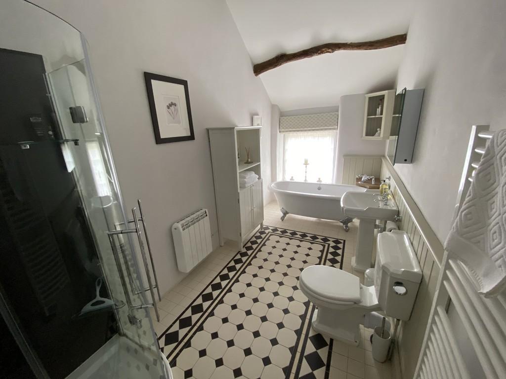 The oak staircase ascends to the second floor which provides an open plan master suite with balustrading, engineered oak flooring and a high vaulted ceiling with lovely, exposed purlins and enhances the feeling of space with a window to the front offering village views. The bedroom has a stunning en suite bathroom complete with a rolltop bath on ball and claw feet, timber painted wainscot surrounds, pedestal wash hand basin, low level WC, and a corner shower unit with glazed enclosure. There is decorative tiled floor, heated towel rail, vaulted ceiling with exposed purlins and illuminated mirror fronted cabinet.