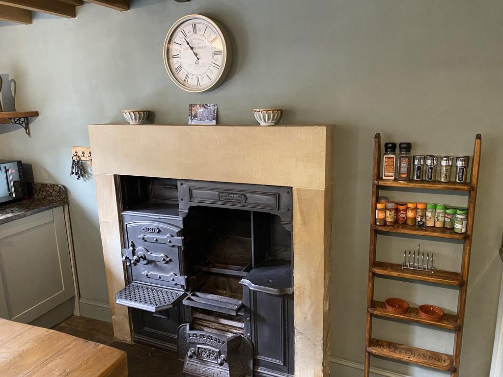To the rear of the living room is a delightful and spacious dining kitchen which has been tastefully fitted with an extensive base cupboards and drawer units surmounted by granite worktops having inset 1.5 bowl stainless steel sink and mixer tap, integrated wine cooler, dishwasher, washing machine and fridge together with an inset Rangemaster classic electric range cooker with splashback and extractor hood over. Character is in abundance with a restored cast iron solid fuel range marked 'W Barns Ltd Ashbourne' set within a stone surround. There are beautiful, exposed oak beams and LED lighting together with the underfloor heated flagstone floor and a stone mullion window overlooking the rear, plus a door giving access to the rear courtyard.